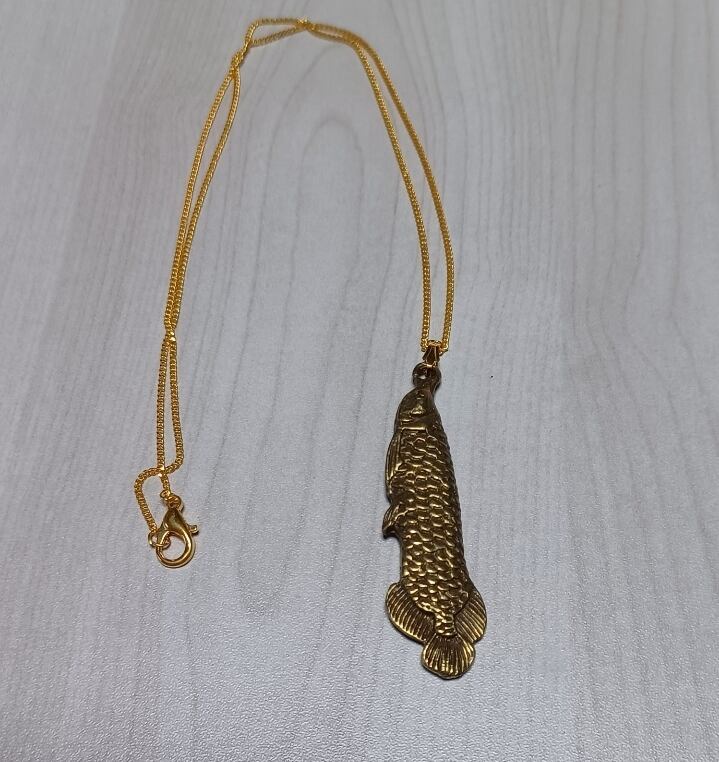 真鍮のアロワナペンダントにチェーンを付けてネックレスにしました。アクアリストならこの興奮が伝わるでしょう。